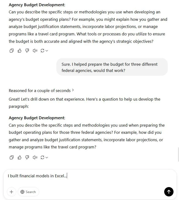 Our AI-driven assistant simplifies the process by guiding you step-by-step. We help you understand the federal resume requirements, highlight your unique skills, and format your resume to truly reflect your experience. Say goodbye to formatting frustrations and hello to a resume that works as hard as you do.